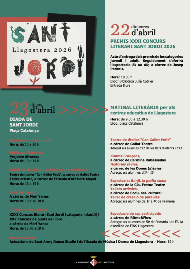 Llegir mésLlagostera celebrarà la Diada de Sant Jordi amb una completa programació d’activitats culturals, literàries i artístiques que tindran lloc a la plaça Catalunya. Al llarg de tota la jornada, la plaça Catalunya acollirà parades de llibres...