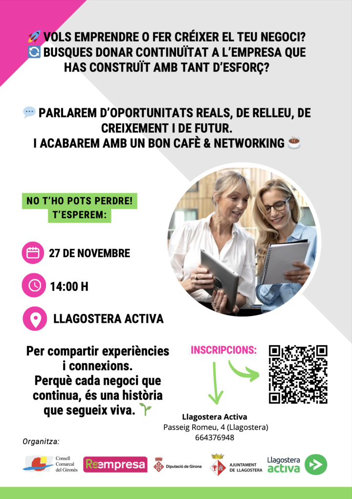 Llegir mésEl proper 27 de novembre, a les 14 h, Llagostera acollirà una sessió informativa sobre Reempresa, el servei que facilita la transmissió de negocis i acompanya emprenedors, empreses i persones interessades a donar continuïtat a projectes empresarials ja existents. L&rsquo...