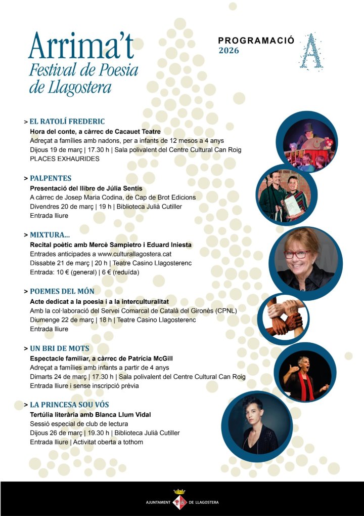 Llegir mésAquesta setmana comença l’Arrima’t, el festival de poesia de Llagostera. Del 19 al 26 de març podreu gaudir de diferents propostes per a tots els públics. Arrima’t, Festival de poesia de Llagsotera, és una iniciativa transversal dedicada a la li...