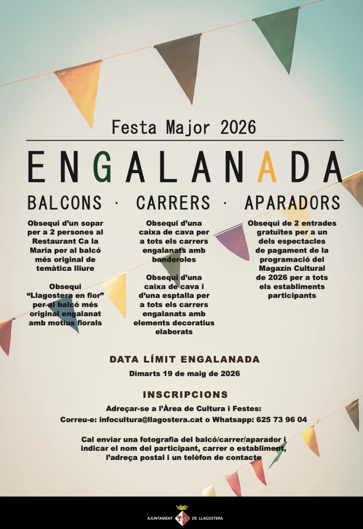 Llegir mésUn any més arriba el concurs d’engalanament de balcons, carrers i aparadors de la Festa Major. La data límit per tenir els espais engalanats és el dimarts 19 de maig de 2026. Per participar-hi, cal adreçar-se a l’Àrea de Cultura i Festes enviant...