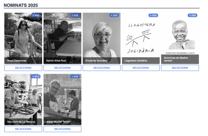 Rosa Casanovas, Narcís Amat Ruiz, Encarnita González, Josep Montiel "Monti", Somriures de Madina Jambor, Llagostera Solidària i el grup de voluntaris de La Reserva són els nominats a rebre el Premi Ou de Reig 2025. Les votacions es poden fer en línia des de llagostera.org/participacio fins al dia 10 d’octubre a les 12 del migdia.